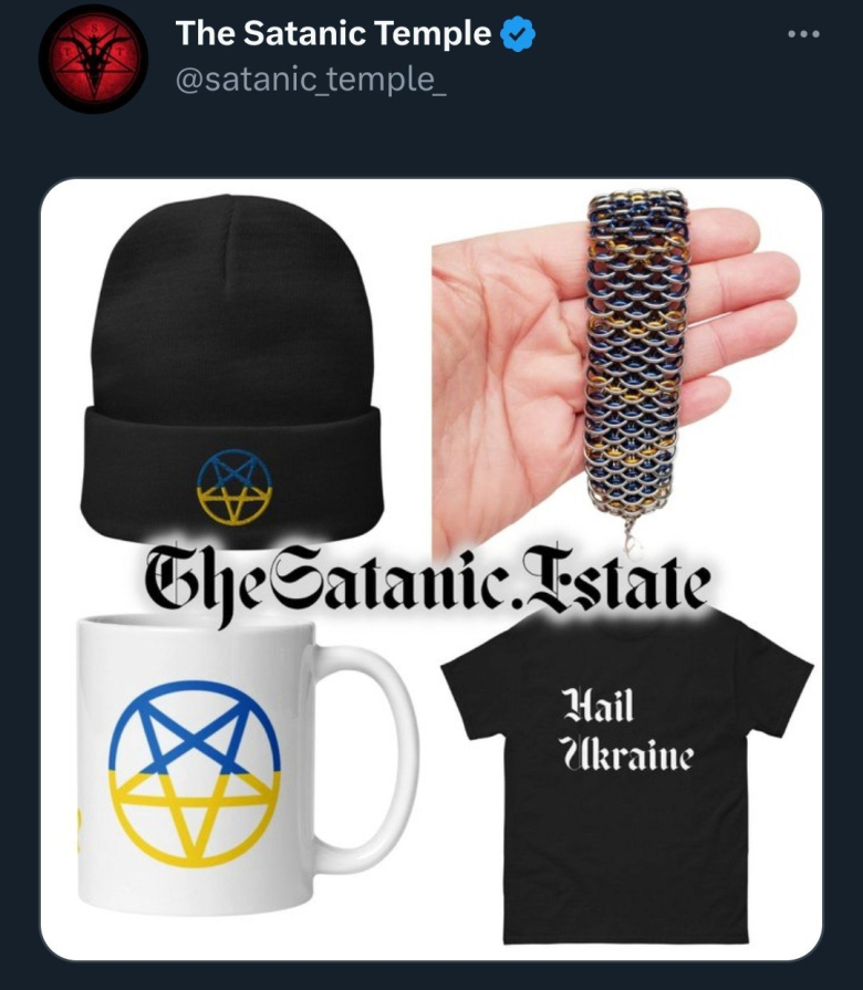 ԶարկերակԱՄՆ-ում օրինական գրանցում ունեցող «Սատանայական տաճար» կրոնական կազմակերպությունը հայտարարեց իր աջակցության մասին ուկրաինացի փախստականներին, զեկուցեց Ուկրաինայի սատանիստների համար հավաքած միջոցների մասին, ինչպես նաեւ թողարկեց հուշանվերների նոր հավաքածու: