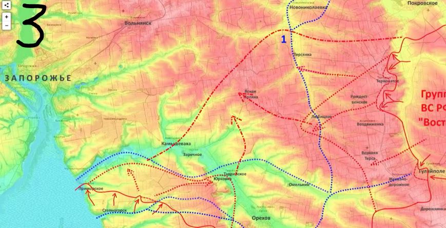 Շատ ավելի վտանգավոր է Գույյայպոլեից դեպի հյուսիս` Տերնովատոեի հատվածում ծավալվեց իրադարձությունները: Տերնովատոեն ուկրաինական բոլոր պատրաստի պաշտպանական գծերից այն կողմ է: Այդ բնակավայրը ռուսներն այս պահին գրոհում են երեք ուղղությունից, եւ դրա գրավելն օրերի հարց է: Բայց դրա հետ միաժամանակ, ռուսական ուժերն արդեն այդ հատվածից զարգացնում են հարձակումը դեպի արեւմուտք, եւ արդեն հաջորդ բնակավայրերի` Ռոժդեստվենսկոե - Վոզդվիժեվկայի մատույցներում են (Քարտեզ 3): Դրանք գրավելով, կհարվածեն Լյուբիցկոեի ուղղությամբ, որտեղով, ինչպես ուկրաինական կեղմ է տեղեկացրել, կառուցվում է նոր պաշտպանական բնագիծ (Քարտեզում` 1): Բայց այն պատրաստ չէ, ավելին, մոտ 20-25 կիլոմետրանոց հատվածում դեռ աշխատանքներ չեն սկսվել: Այն է` ռուսների արագ առաջխաղացման դեպքում, որը, դատելով ներկա տեմպերից, շատ հնարավոր է, այդ բնագիծն էլ, դեռ չկառուցված, կհայտնվի ռուսական ուժերի թիկունքում: Ու կախված այն հարձակումից, որն ընթանում է արեւմտյան ուղղությունից, ռուսները սպառնում են շատ ավելի խորը շրջապատման մեջ վերցնել ուրաինական ողջ հարավզապորոժյան ճակատը: Միաժամանակ, հաջող օպերացիայի դեպքում, որը, կրկնենք, ռուսները պետք է իրականացնեն մի հատվածում, որտեղ ուկրաինացիներն այլեւս կառուցված պաշտպանական բնագծեր չունեն, ռուսական ուժերը դուրս կգան Զապորոժե քաղաքի հեռվոր մատույցներ: