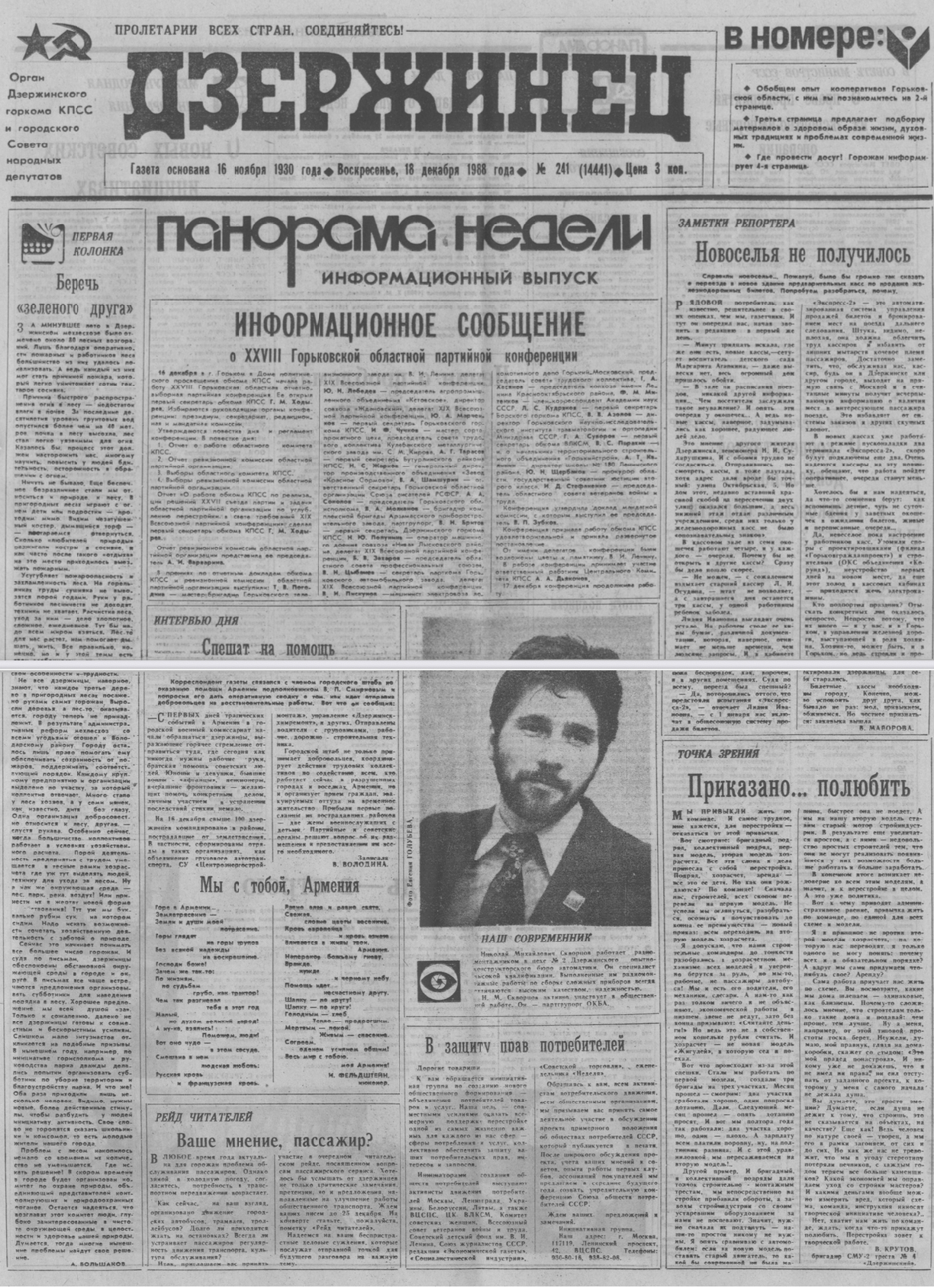 Поэт из Дзержинска, участник VI Международного литературного конкурса «Армянские мотивы»-2025 Сергей Кувшинов недавно прислал мне pdf-файл городского издания «Дзержинец» за 18 декабря 1988 года. Его внимание привлекло стихотворение Исаака Борисовича Фельдштейна, посвящённое жертвам Спитакского землетрясения. Сергей поделился со мной: «До этого с публикацией знаком не был, так как в то время проходил службу в армии, в городе Электросталь. После землетрясения в учебную часть пришло новое пополнение. В нашу роту распределили около двух десятков ребят из Армении. Через несколько дней их всех отправили служить по месту призыва. А я 18 декабря был отправлен под Котлас. Никогда не забуду, как в Москве все залы ожидания на вокзалах были заполнены женщинами с детьми. Горе, слёзы. А дети — улыбались».