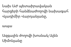 Խոշոր կոտոշավորի գլուխը պետք է մցնել, որ ոչ պաշտոնն ա հավերժ, ոչ էլ հաստվզերն են... Հետաքրքիր է Արևմուտքը ժողովրդավարության ինդեքսը հաշվելուց հասարակ մարդկանց վրա թ... Սրբապղծությունը չափ ու սահման չունի` արդեն ուղիղ 5 տարի. Արմեն Հովասափյան Էդ բռնող թիկնապահները եթե տեղյակ չէին ինչի համար են բռնում քաղաքացուն պետք է հրա... Ասպրամ Կրպեյանի հետ պատմում ենք, թե իչպես է Ալեն Սիմոնյանը թիկնապահներին հանձնար... Սրանք Ալիեւի հետ բոլոր հարցերում են գործում սինքրոն, համաձայնեցված եւ ծրագրային.... Մենք պետք է ապրենք այս ամենը թույլ չտալու համար, մենք չպետք է տրվենք ինֆորմացիոն... Ադրբեջանը Հայաստանում առաջընթաց ունի, իսկ այդ ծաղրածուն կիսատ֊պռատ հոլովակ է հրա... Խաչատուրովին ու ընդդիմադիր պատգամավորին կալանավորելու փոխարեն թուրքի առաջխաղացու... Ես պայքարել եմ առաջին օրվանից, պայքարում եմ ու պիտի պայքարեմ արժանապատիվ լրագրու... Մի բան միայն լավ չեն հաշվարկել, որ ժողովուրդն էլ առաջվանը չէ ու շատ լավ գիտի, ո... Մհեր, պայքարի ընկեր ջան, արժանապատիվ մարդ ջան, կներես, որ քեզ էլ մարդակերներին հ... Թե ԱԺ-ի քաղաքական մեծամասնության բիոզանգվածը, թե նրանց սպասարկող իրավապահները փո... Նիկոլի «ֆաս» հրամանը կատարող քպ-ականը ԱԺ-ում փողոցային ռազբորկա է կազմակերպում, ... Նիկոլը կատարում է Ալիևին տված իր բոլոր խոստումները, Նիկոլը տալիս է, Ալիևը` վերցն... Քվեարկեք ՔՊ-ի օգտին` մնացածը Նիկոլը կանի. Արտակ Զաքարյան Lragir.am–ի ամբողջ անձնակազմին. Տիգրան Վարդանյան Բա որ «ժողովրդավար Հայաստանը» ավտորիտար Ադրբեջանի դեմ անգամ «ժողովրդավար ընտանիք... Որքան էլ Նիկոլը փորձի կեղծ արդարացումներ գտնել իր դավադիր պարտության համար՝ չի ս... ՍԴ ներկայիս կազմն ընդամենը գործիք է այս իշխանության ձեռքին, որով փորձում են իրեն...