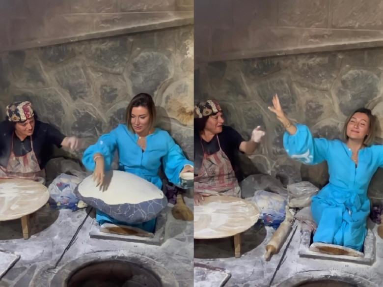 Այնուհետև հայկական օջախներից մեկում նա լավաշ է թխում, երգում, պարում: