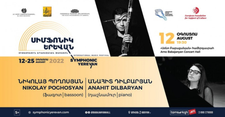 ՄշակութայինՕգոստոսի 12-ին` 19:30-ին «Առնո Բաբաջանյան» համերգասրահում տեղի կունենա «Սիմֆոնիկ Երևան» միջազգային երաժշտական փառատոնի բացման համերգը: Ելույթ կունենան ֆագոտահար Նիկոլայ Պողոսյանը և դաշնակահար Անահիտ Դիլբարյանը։