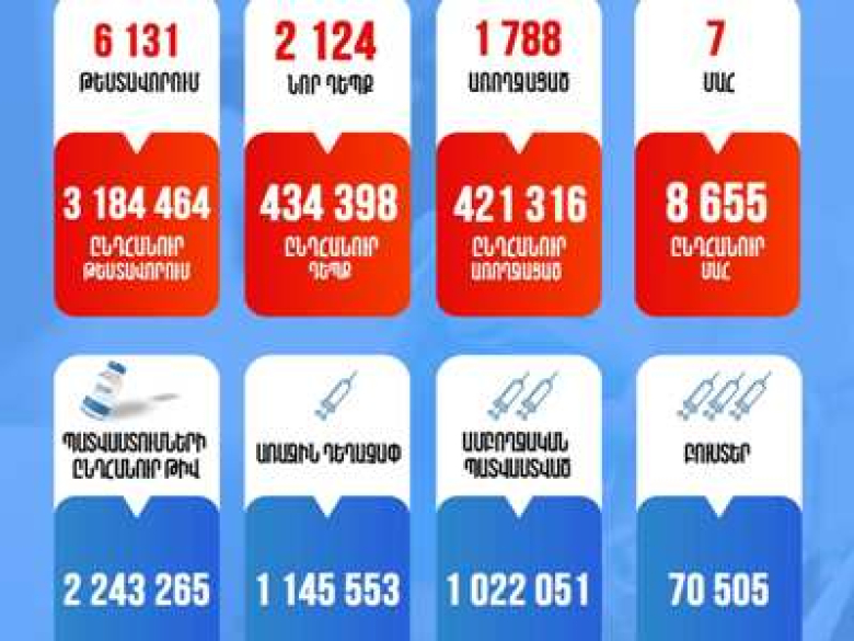 Վերջին մեկ շաբաթում կատարվել է 6131 թեստավորում: Մինչև այժմ կատարված թեստավորումների ընդհանուր թիվը 3184464 է: