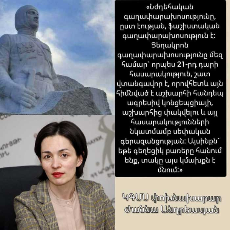 3․ «Նժդեհական գաղափարախոսությունն, ըստ էության, ֆաշիստական է եւ մեզ համար շատ վտանգավոր, որպես 21-րդ դարի հասարակություն, որովհետեւ այն հիմնված է աշխարհի հանդեպ ագրեսիվ կոնցեպցիայի, աշխարհից փակվելու եւ սեփական գերազանցությունը մնացյալ հասարակությունների հանդեպ սահմանելու, այսինքն՝ մենք չենք կարող բոլորին ձեռ առնել եւ պահանջել հարգանք, մենք այս պահին ունենք մենախոսություն․․․».