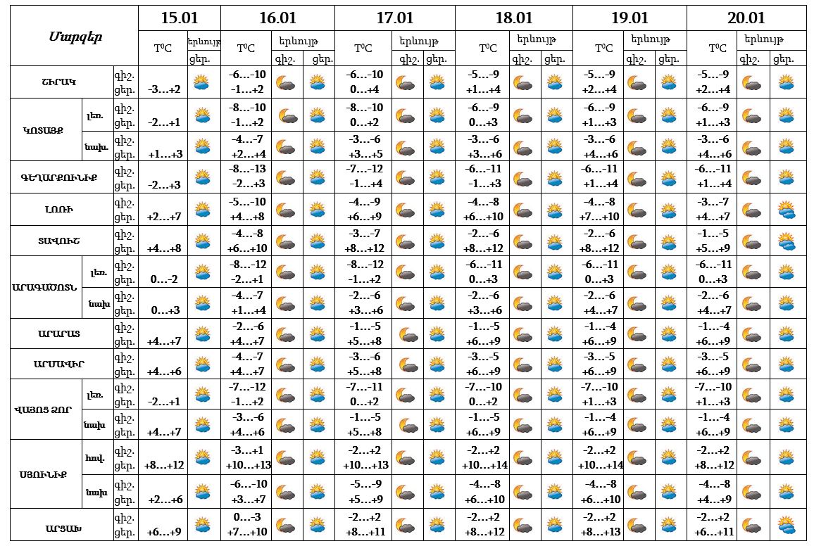 Օդի ջերմաստիճանը հունվարի 15-19-ի ցերեկային ժամերին աստիճանաբար կբարձրանա 6-8, Արարատյան դաշտում և նրա նախալեռնային շրջաններում՝ 4-5 աստիճանով: