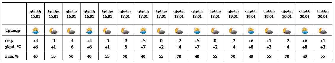 Հունվարի 15-ի ցերեկը, 16-20-ը սպասվում է առանց տեղումների եղանակ: