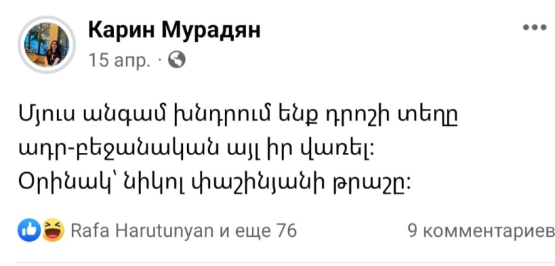 Մեր կուսակից ընկերներից Կարին Մուրադյանին հետևյալ գրառման համար կանչել են քննչական կոմիտե հարցաքննության`հրապարակային բռնության կոչ անելու հոդվածով հարուցված քրեական գործի շրջանակներում։
