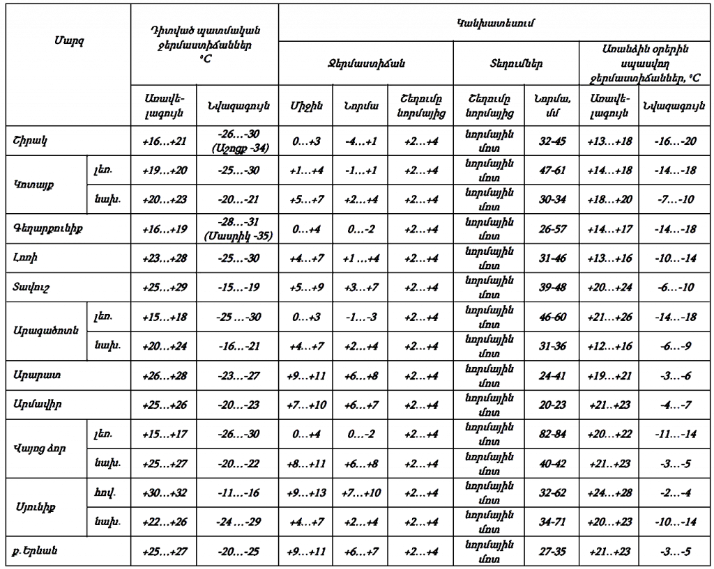 Օդի ամսական միջին ջերմաստիճանը հանրապետության ողջ տարածքում կանխատեսվում է նորմայից բարձր 2-4 աստիճանով, տեղումների քանակը նորմային մոտ։