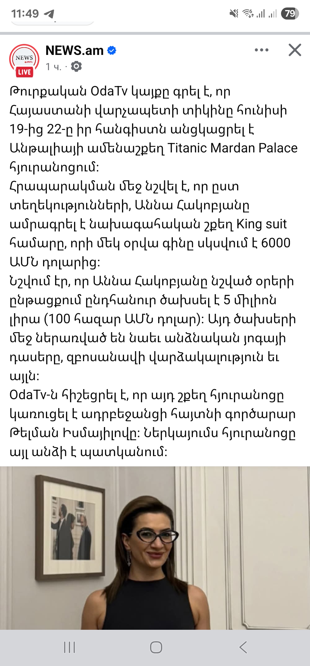 ԹեմաԹուրքական OdaTv կայքը գրել է, որ Հայաստանի վարչապետի տիկինը հունիսի 19-ից 22-ը իր հանգիստն անցկացրել է Անթալիայի ամենաշքեղ Titanic Mardan Palace հյուրանոցում։