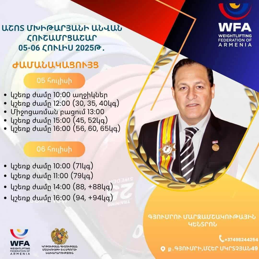 ՍպորտՀուլիսի 5-6-ը, Գյումրիի մարզամշակութային կենտրոնում կկայանա լեգենդար մարզիչ ԱՇՈՏ ՄԽԻԹԱՐՅԱՆԻ անվան հուշամրցաշարը։ Աշոտ Մխիթարյանը ոչ միայն եղել է Հայաստանի հավաքականի գլխավոր մարզիչը, այլև տարիներ շարունակ մարմնավորել է հայկական ծանրամարտի հոգին ու պայքարը։ Նա սիրված էր ամբողջ հանրապետությունում և հայտնի էր որպես «Հայկական Ծանրամարտի Նորին Գերազանցության մարզիչը» անվամբ։ Պաշտոնական բացման արարողությունը կկայանա ժամը 13։00 ֊ին Գյումրիի Մարզամշակութային կենտրոնում։ Հուշամրցաշարը կլինի ոչ միայն մարզական պայքար, այլև մեծարանքի խոսք, արժանին մատուցելու նրա անցած ուղուն։