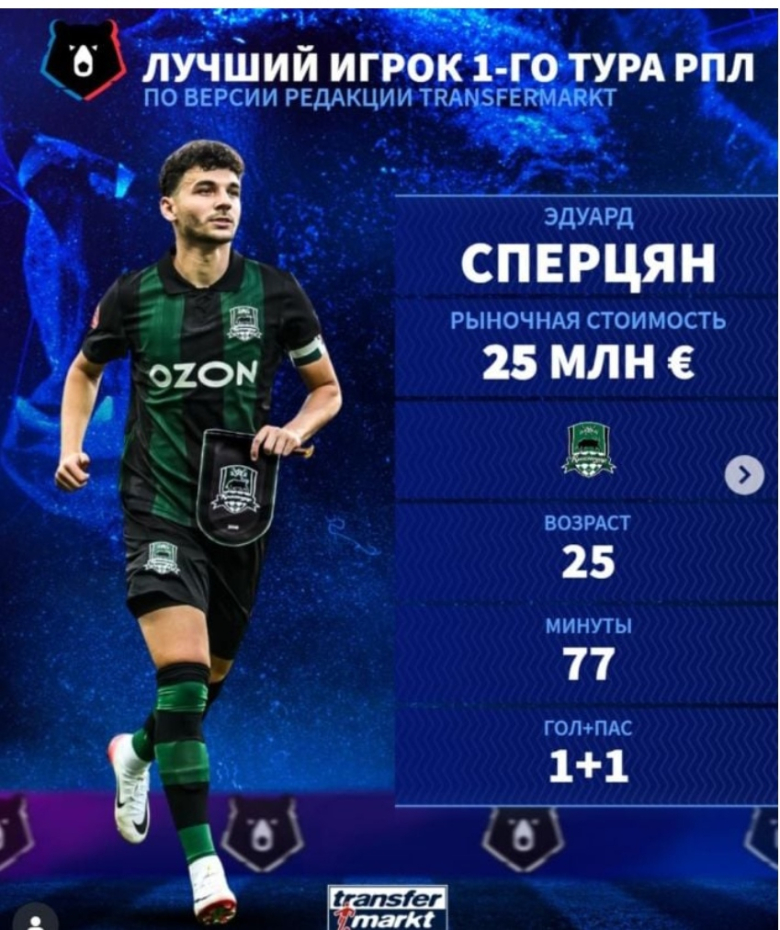 ՍպորտTransfermarkt-ի վարկածով Ռուսաստանի Պրեմիեր լիգայի մեկնարկային տուրի լավագույն խաղացող է ճանաչվել Ռուսաստանի չեմպիոն «Կրասնոդարի» եւ Հայաստանի հավաքականի կիսապաշտպան Էդուարդ Սպերցյանը։