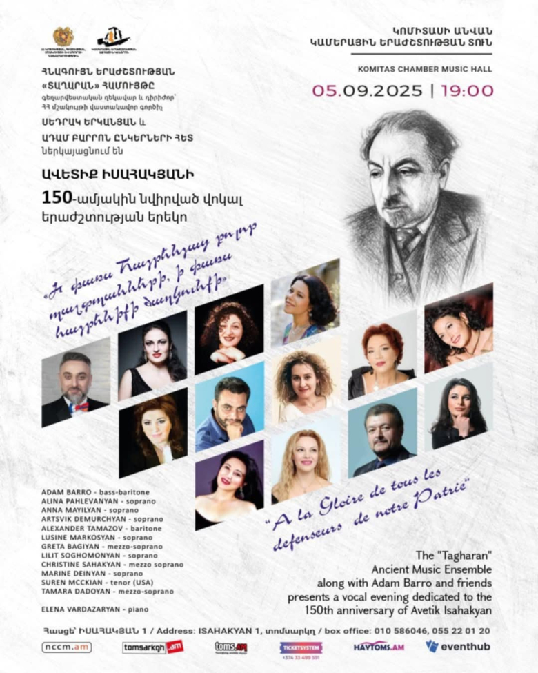 ԱզդագրերԿոմիտասի անվան կամերային երաժշտության տանը սեպտեմբերի 5-ին ՝ ժամը 19:00-ին, Հնագույն երաժշտության «Տաղարան» համույթը, Ադամ Բարրոն եւ ընկերները հրավիրում են Ավետիք Իսահակյանի 150-ամյակին եւ նրա անունը կրող Երեւանի առաջին հանրային գրադարանի հիմնադրման 90-ամյակին նվիրված՝ «Ի փառս Հայրենյաց բոլոր պաշտպանների, ի փառս հայրենիքի ծաղկունքի» խորագրով վոկալ երաժշտության երեկոյին: