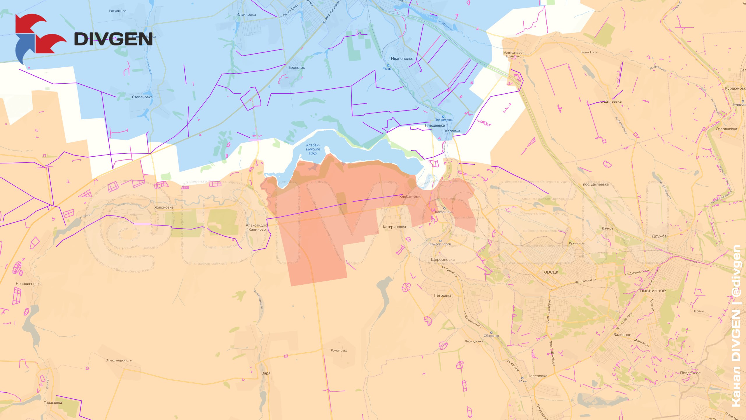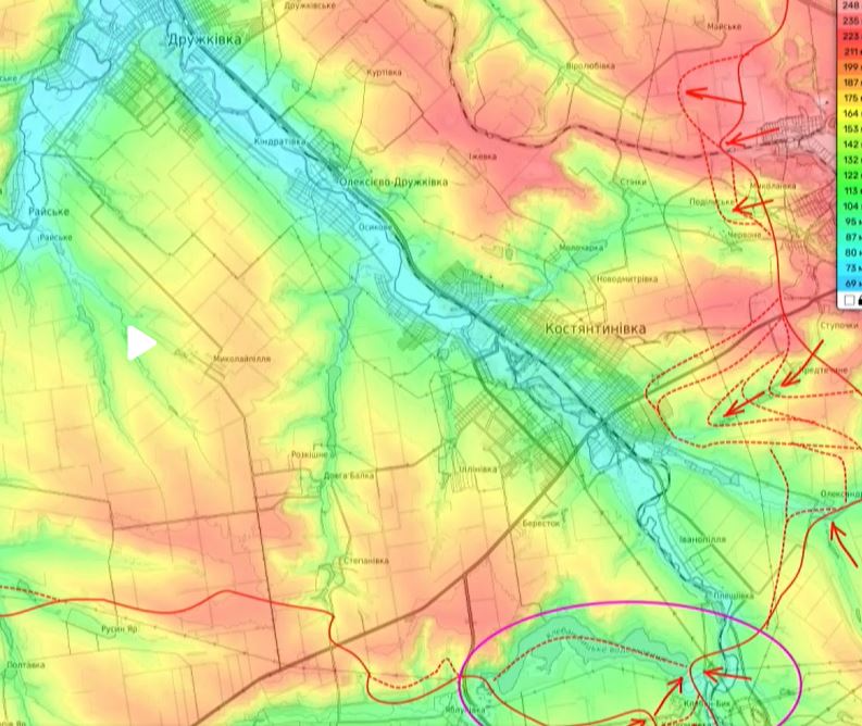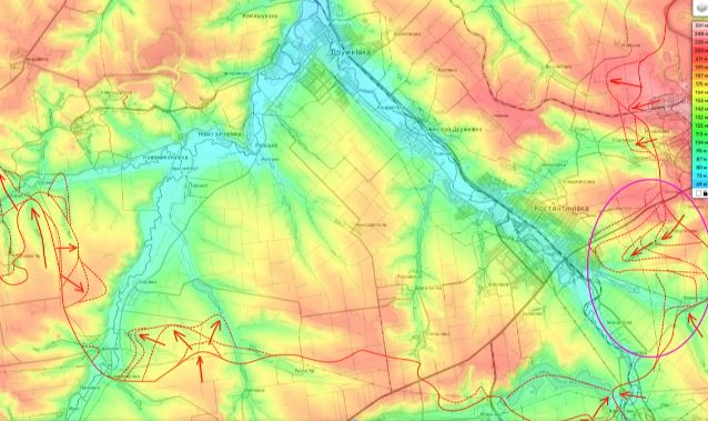 Սակայն այս կորուստ ոկրաինական կողմի համար դեռ ամբողջ խնդիրը չէ: Կոնստանտինովկայի ուղղությամբ ռուսները, ինչպես ներկայացրել ենք, հարձակվում են նաեւ արեւելքից (Տես նաեւ https://iravunk.com/?p=321064&l=am): Եվ ահա հիմա, ինչպես եւ ենթադրվում էր, մաքրելով Կլեբան-Բիկի ջրամբարի հարավային գոտին, ռուսները նաեւ հարավից են աքցանավորելու քաղաքը: Զուգահեռմ նկատվում է նաեւ Չասով Յարի հատվածից դեպի Կոնստանտինովկայի հյուսիս ճեղքելու ուղությամբ սկսվող մոծ հարձակում: