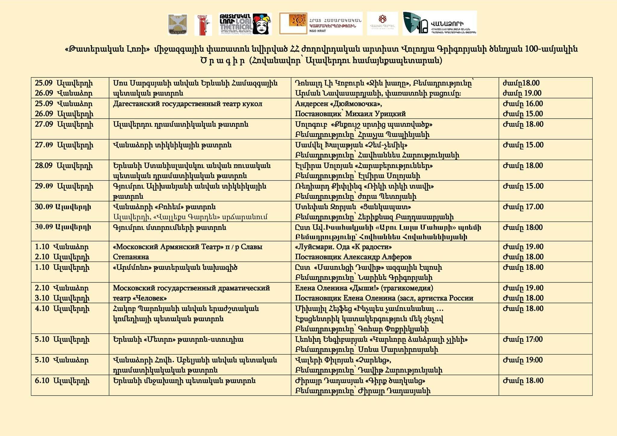 Սեպտեմբերի 30-ին նույն ներկայացումը կցուցադրվի Ալավերդիում՝ «ԹԱՏՐԵԿԱՆ ԼՈՌԻ» 31-րդ միջազգային փառատոնի շրջանակում։ Փառատոնը նվիրված է ՀՀ ժողովրդական արտիստ Վոլոդյա Գրիգորյանի 100-ամյակին։
