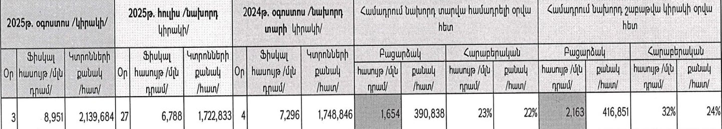 Տվյալներում ներառվել են 2025 թվականի օգոստոսի 3-ի՝ կիրակի օրվա, նախորդ կիրակի օրվա, 2025 թվականի հուլիսի 27-ի եւ նախորդ տարվա օգոստոսի 4-ի առաջին կիրակի օրվա ՀԴՄ գործարքների ցուցանիշները, որոնք վերլուծության առումով առավել համադրելի են եւ կարող են պայմանավորված լինել նշված իրադարձությամբ: