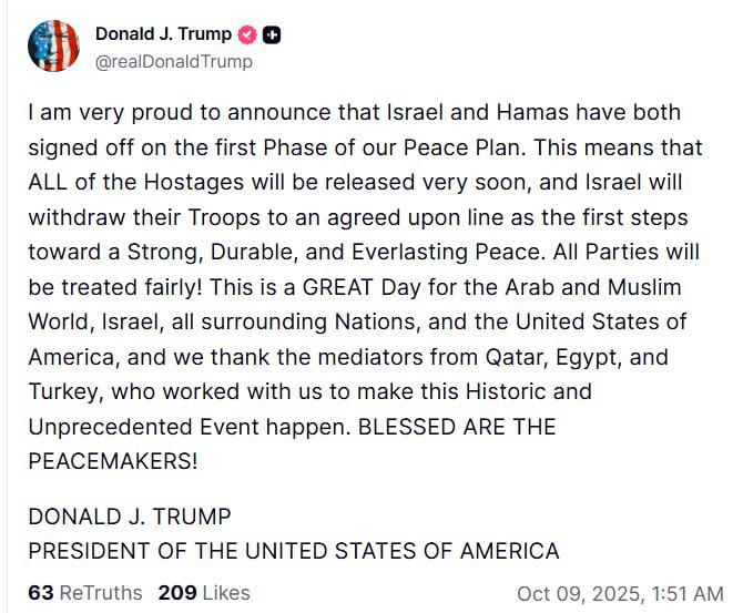«Ես չափազանց հպարտ եմ հայտարարել, որ Իսրայելը և ՀԱՄԱՍ-ը ստորագրել են մեր խաղաղության ծրագրի առաջին փուլը։ Սա նշանակում է, որ ԲՈԼՈՐ պատանդները շատ շուտով կազատվեն, և Իսրայելը իր ուժերը կհեռացնի համաձայնեցված գծին՝ որպես առաջին քայլ դեպի երկարատև, կայուն և հավերժական խաղաղություն։ Բոլոր կողմերի հետ կվարվեն արդարացիորեն։ Սա ՄԵԾ օր է արաբական և մուսուլմանական աշխարհի, Իսրայելի, բոլոր հարակից երկրների և Ամերիկայի Միացյալ Նահանգների համար, և մենք շնորհակալություն ենք հայտնում Կատարի, Եգիպտոսի և Թուրքիայի միջնորդներին, ովքեր մեզ հետ աշխատեցին այս պատմական և աննախադեպ իրադարձության իրականացման համար։ Օրհնյալ լինեն խաղաղապահները»։