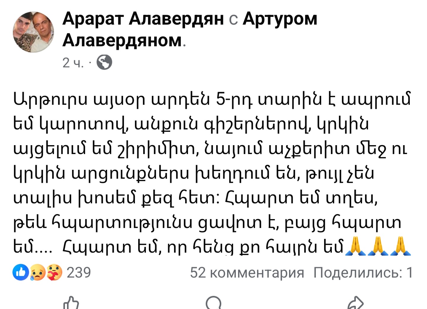 Արթուրս այսօր արդեն 5-րդ տարին է ապրում եմ կարոտով, անքուն գիշերներով, կրկին այցելում եմ շիրիմիտ, նայում աչքերիտ մեջ ու կրկին արցունքներս խեղդում են, թույլ չեն տալիս խոսեմ քեզ հետ: Հպարտ եմ տղես, թեև հպարտությունս ցավոտ է, բայց հպարտ եմ.... Հպարտ եմ, որ հենց քո հայրն եմ։