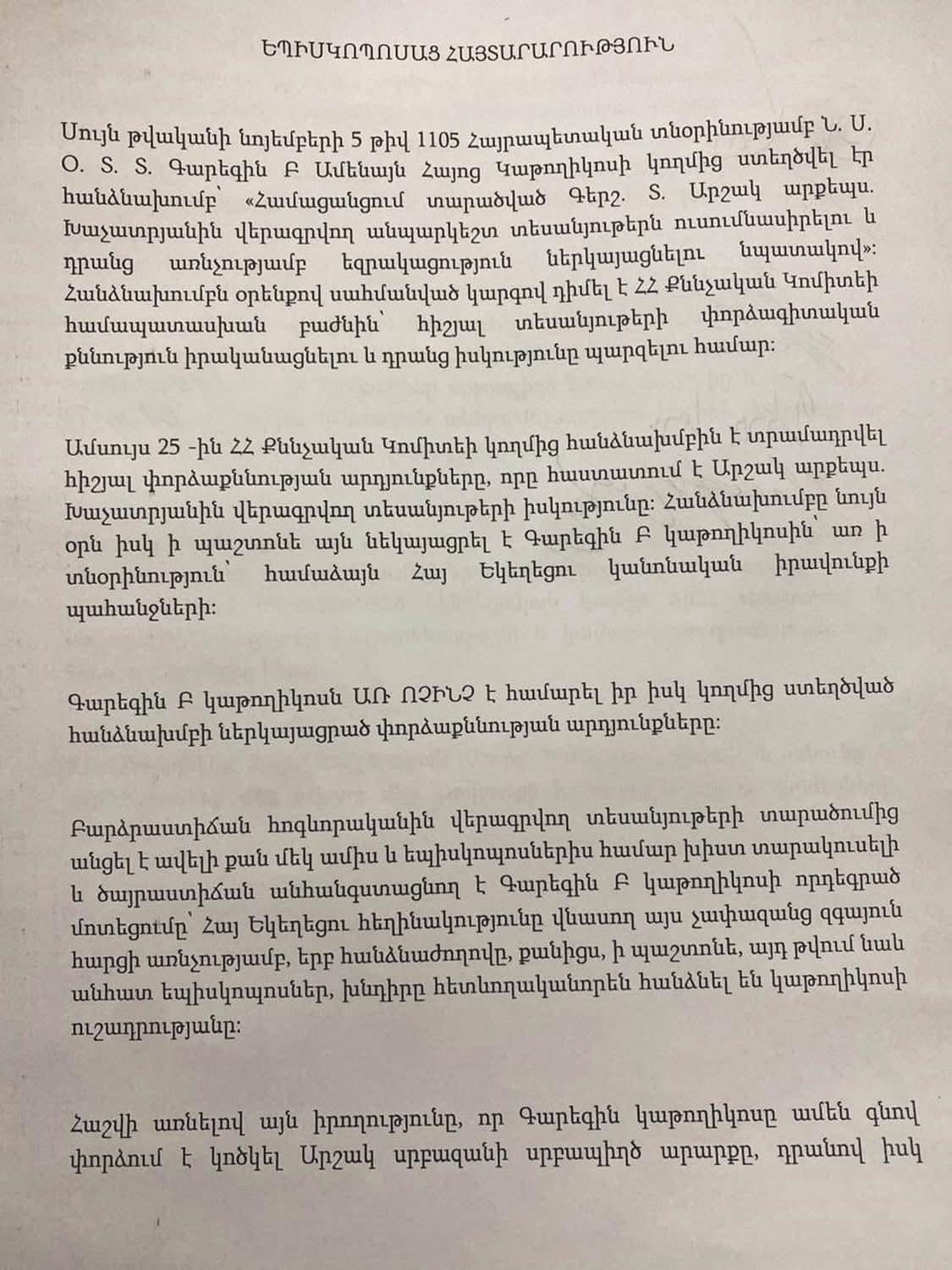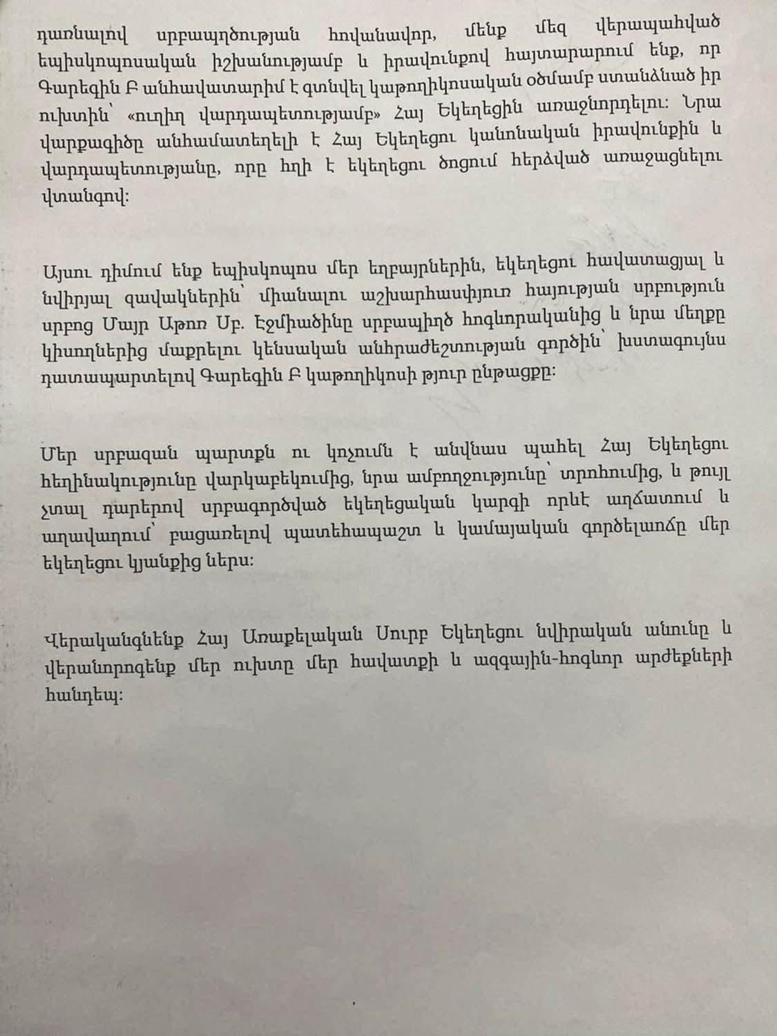 Հայ առաքելական եկեղեցու Արարատյան Հայրապետական թեմի առաջնորդական փոխանորդ, արքեպիսկոպոս Նավասարդ (Սամվել) Կճոյանը եւ մի շարք Սրբազաններ դիմել են Վեհափառ Հայրապետին