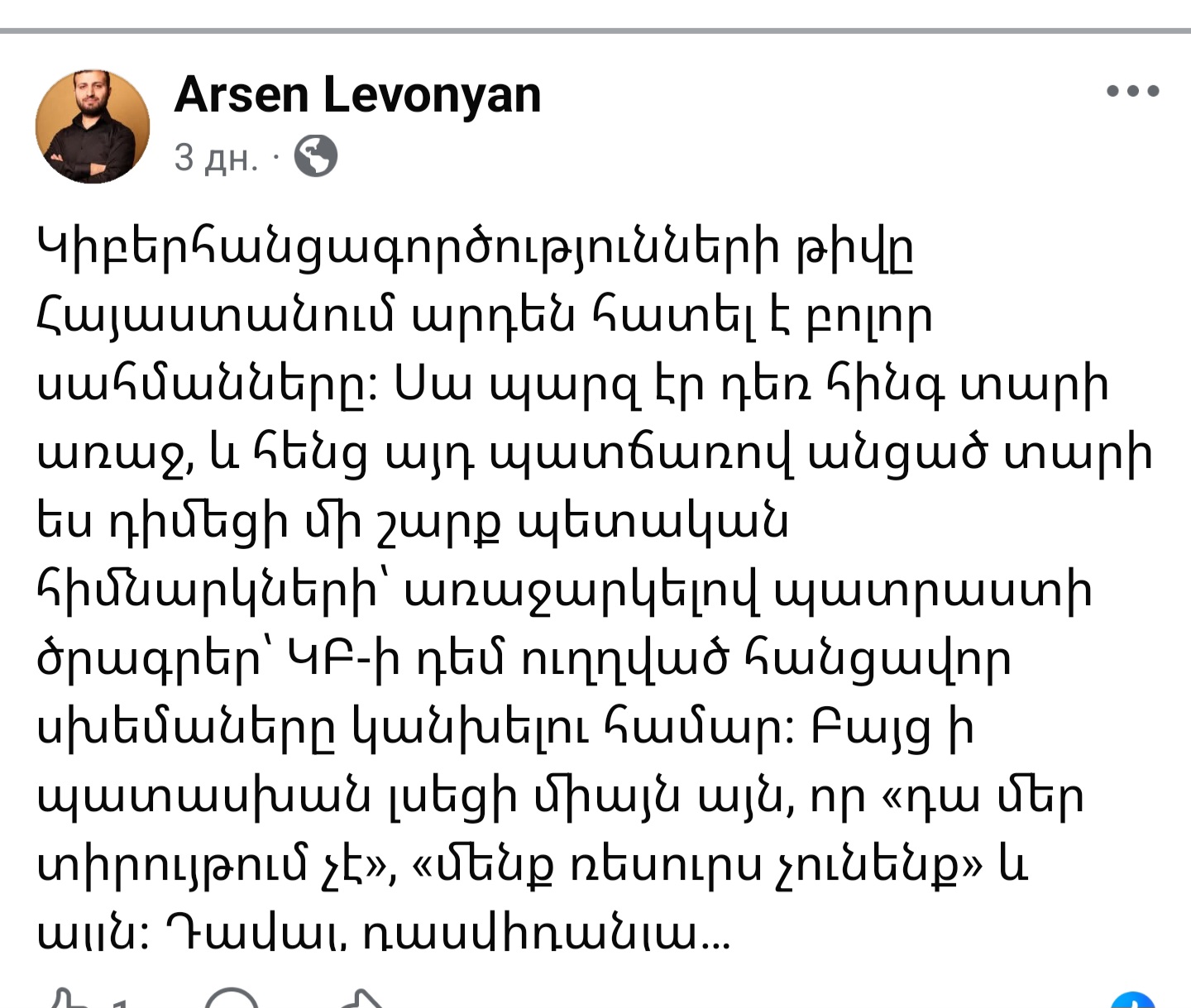 Ի դեպ նշենք, որ մասնագետը դեռ օրեր առսջ իր ՖԲ էջում գրել էր, որ ՀՀ֊ում կիբեռ հանցագործությունների թիվը հատել է բոլոր սահմանները։