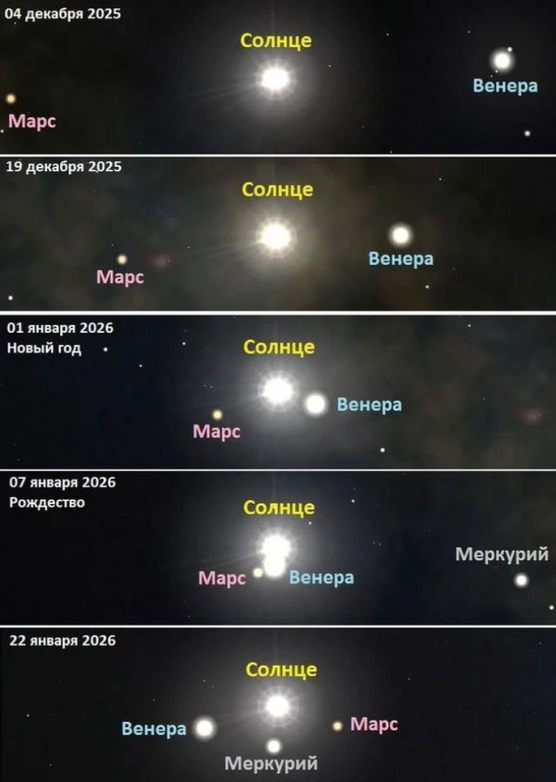 «Երեք մոլորակների առաջիկա շքերթն անզեն աչքով տեսանելի չի լինի։ Դա պայմանավորված է նրանով, որ մոլորակները կորչում են արևի ճառագայթների մեջ»,-ՏԱՍՍ-ին հայտնել են Ցիոլկովսկու անվան գեղարվեստի պետական թանգարանի ֆիզիկայի և աստղագիտության բաժնից։
