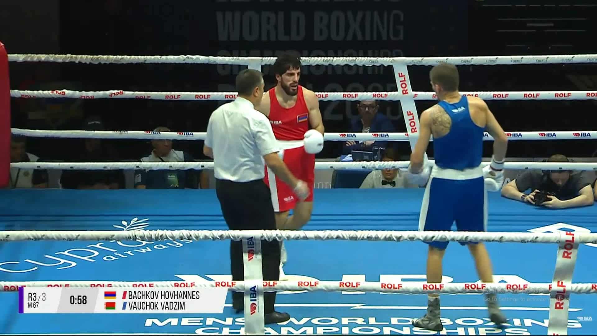 ՍպորտԴուբայում շարունակվող Բռնցքամարտի IBA Աշխարհի առաջնությանը, մեր երկրի ներկայացուցիչ, անվանի բռնցքամարտիկ ՀՈՎՀԱՆՆԵՍ ԲԱՉԿՈՎԸ, 67 կգ քաշային կարգում, կիսաեզրափակչում մենամարտեց ՌԴ ներկայացնող Եվգենի Կուլի հետ ու ափսոս զիջեց 2։5 հաշվով։ Բոլոր 3 ռաունդներում Բաչկովը վստահ մենամարտ էր վարում, գրոհներով ու հակագրոհներով պրեսինգի ենթարկում մրցակցին։ Սակայն, մրցավարները առավելությունը տալիս էին ռուս մրցակցին, ու ցավոք մրցավարները բացահայտ անարդար վարվեցին մեր մարզիկի հետ։ Բաչկովը, չթաքցրեց հուզմունքը, նա պարգևատրվեց բրոնզե մեդալով ու ռինգից հեռանալիս անմիջապես հետո հանեց բրոնզե մեդալը պարանոցից։ Նրա մենամարտին հետևում էր բռնցքամարտի միջազգային ֆեդերացիայի նախագահ IBA Ումար Կրեմլովը։