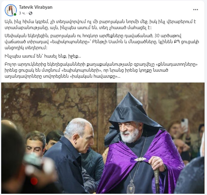 Սեփական եկեղեցին, բարոյական ու հոգևոր արժեքները դավաճանած, 30 արծաթով վաճառած տիրադավ «եպիսկոպոսները»՝ Բենթլի Սամոն և մնացածները, կլինեն ՔՊ ցուցակի անցողիկ տեղերում։ Ինչպես ասում են՝ հասել ենք, իջեք... Բոլոր արդուկներից եկեղեցականների քաղաքականությամբ զբաղվելը «քննադատողները» իրենց ցուցակ են մտցնում «եպիսկոպոսների», որ նրանց իրենց կողքը նստած աղանդավորները սովորեցնեն «իսկական հավատքը»...», - գրել է քաղակտիվիստ ՏԱԹԵՎԻԿ ՎԻՐԱԲՅԱՆԸ: