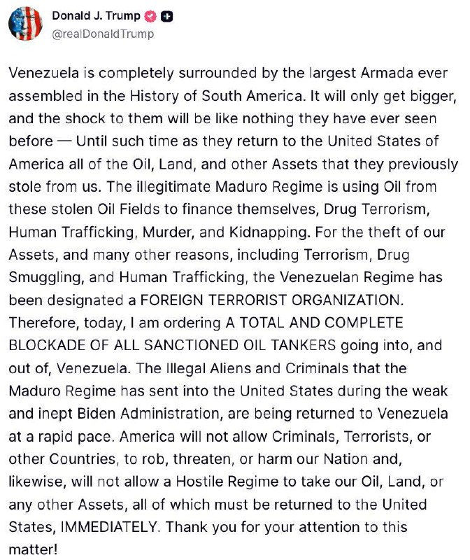 ՄիջազգայինԱրժե նշել, որ բոլոր ամերիկյան նախագահներից Թրամփն ամենաազնիվն է։ Նա գոնե բացահայտ ասում է, որ Վենեսուելայում իր գլխավոր շահը ԴԵՄՈԿՐԱՏԻԱՆ չէ, այլ նրա ՆԱՎԹԸ։ Որը նա արդեն հայտարարել է ԱՄԵՐԻԿՅԱՆ, և որը, նրա կարծիքով, վենեսուելացիները իրավունք չունեն արդյունահանելու։ Հետևաբար, նա հայտարարում է Վենեսուելայի ռազմածովային շրջափակման մասին և կբռնագրավի ԱՄՆ-ից «գողացված» ամբողջ վենեսուելական նավթը.