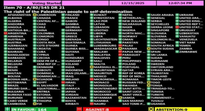 ՄԱԿ-ի Գլխավոր ասամբլեան բանաձև է ընդունել, որը հաստատում է Պաղեստինի ժողովրդի ինքնորոշման և անկախ պետություն ստեղծելու իրավունքը: Փաստաթուղթը պաշտպանել է 164 երկիր, դեմ է արտահայտվել 8-ը, այդ թվում՝ ԱՄՆ-ն եւ Իսրայելը, եւս 9 պետություն ձեռնպահ է մնացել:
