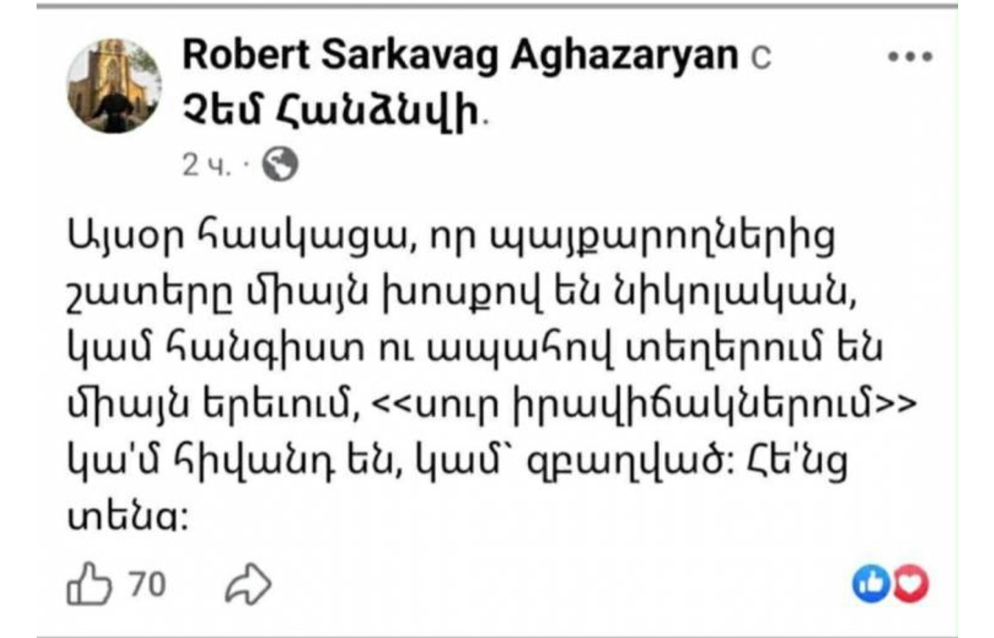Նրանցից մեկը` կարգալույծ եղած նիկոլական սարկավագ Ռոբերտ Աղազարյանը անգամ ՖԲ իր էջում նիկոլականներին կշտամբող գրառում է առել ու երկու ժամ անց ջնջել գրածը, հավանաբար՝ վերևների հրահանգով․