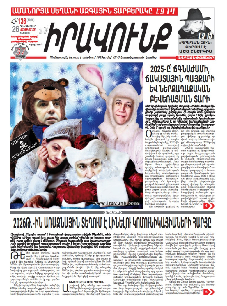 ⚡️⚡️«Իրավունք» թերթի այսօրվա տպագիր համարում կարդացե՛ք...Մահացել է դերասան Կամո ԱռաքելյանըՀրապարակվել է Սպերցյանի ստեղծած պահերի վիճակագրությունըGoal-ը թարմացրել է 2026թ.-ի «Ոսկե գնդակի» հավակնորդների վարկանիշըMMA. ՀԱՅՏՆԻ Է ՄԻՀՐԱՆ ՀԱՐՈՒԹՅՈՒՆՅԱՆԻ ՄՐՑԱԿԻՑԸԱսեց` շրջափակման մեջ եմ, ինձ կպայթացնեմ. ՏԱՐՈՆ ԱՆԴՐԵԱՍՅԱՆԻ ԾՆՆԴՅԱՆ ՕՐՆ ԷԱֆո, Մասիվցի Ժիրո և Արտաշատցի Կիկոս մականուններով հայտնի անձինք են կալանավորվել«Լեվ Գրուպը» մտնում է նոր տարի՝ ամուր մնալով օրենքին, արդարությանը և օրինապաշտ քաղաքացու գաղափարին.Բացառիկ զրույց հայտնի փաստաբանի հետՔիչ առաջ գործընկեր Պետրոս Մեղրյանի հետ «Վարդաշեն» քրեակատարողական հիմնարկում այցելեցինք «Սիսական» ջոկատի հրամանատար Աշոտ Մինասյանին. ԴանիելյանՍևանում, Ճամբարակում, Արթիկում, Սպիտակում ձյուն է տեղում Հրդեհ՝ Նուբարաշենում. Այրվածքներ ստացած քաղաքացուն բուժօգնություն է ցուցաբերվել Հեռախոսազրույց եմ ունեցել Սթիվ Ուիթքոֆի և Ջարեդ Քուշների հետ. ԶելենսկիԱդրբեջանցի փորձագետ.Ադրբեջանը կարող է սկսել կոնյակ և ծխախոտ գնել ՀայաստանիցՆախկին ոստիկանապետ Արամ Հովհաննիսյանի որդին՝ ՔՊ-ի պատգամավորի թեկնածու«Երևանի և Բաքվի միջև երկխոսության մեջ ընդհանուր առմամբ դրական դինամիկա ենք տեսնում.ԶախարովաԹուրքիան եւ Ադրբեջանը ուժեղացնում են միմյանց պաշտպանության գործում իրենց օրինական և միջազգային նորմերին հարիր քայլերի շրջանակըՄարադոնայի պատռված մարզաշապիկը վաճառվել է ռեկորդային գնովԶախարովա.ՌԴ-ի և Ադրբեջանի նախագահների միջև բարեկամական զրույցին միացել է նաև Մեհրիբան ԱլիևանՓոփոխություններ են կատարվել  «Զինվորական ծառայության համար քաղաքացու կամ զինծառայողի պիտանիության աստիճանը որոշող հիվանդությունների ցանկումԵվս մեկ բարեփոխում՝ պրոֆեսիոնալ բանակի անցման ճանապարհին.Պապիկյան
