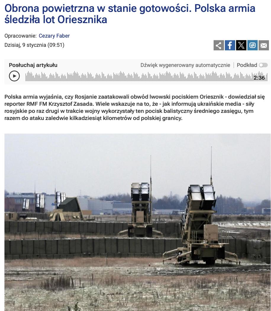 Ուկրաինան նախապես զգուշացրել է Վարշավային հնարավոր հարվածի մասին, ինչը թույլ է տվել լեհական բանակին (անհայտ պատճառով) պատրաստել իր ՀՕՊ համակարգերը և հետևել հիպերձայնային թիրախի հետագծին արձակման պահից։ Չնայած դրան, «Օրեշնիկին» հետեւել, առավել եւս` կանխարգելիչ քայլեր ձեռնարկելու տարբերակներ Լեհաստանի ՀՕՊ համակարգը, որը դրված էր մարտական պատրաստության վիճակի, չի ունեցել։ Ու հիմա ակտիվ քննարկումների թեռմա է դարձել, թե ինչ են անելու, եթե հաջորդ հարվածը գա հենց Լեհաստանին: Հիմնական եզրահագումն այն է, որ պաշտպանվելու որեւէ տարբերակ պարզապես չկա: