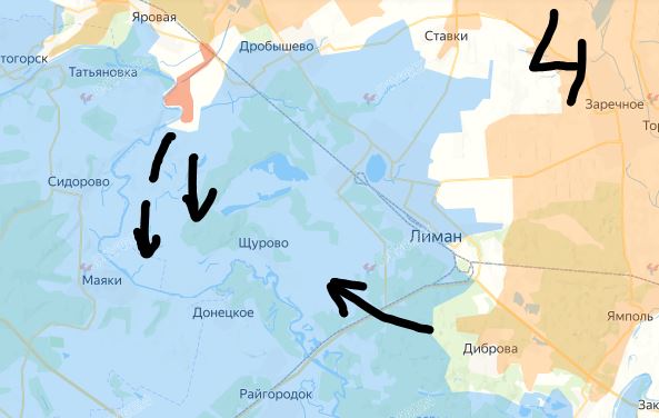 Վերջապես, ընթացող օպերացիայի շրջանակներում ռուսական ուժերն ակտիվ եւ խորը` մոտ 10 կիլոմետրանոց առաջխաղացում ունեն նաեւ Սեւերսկի Դոնեց գետի աջափնյա հատվածում` գետի երկայնքով: Այդպիսով, սկսում են փակել Լիմանի արեւմուտքը (Քարտեզ 4), այն դեպքում, երբ հարավից` Դիբրովայի ուղղությունից կա ընդառաջ հարձակումը, որը կարող է հասցնել Լիմանի ամբողջական շրջապատման:
