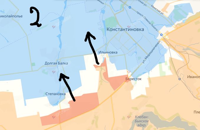 Միաժամանակ ռուսները գրոհում են Ստեպանովկա եւ Դոլգայա Բալկա բնակավայրերը, որոնք գրավելու եւ Իլնովկայի հատվածում ճեղքումային ուժերի թեւն ապահովելու դեպքում ռուսական ստորաբաժանումների առաջ այլեւս խոչնդոտներ չեն մնւոմ` Կոնստանտինովկայի ողջ արեւմտյան թեւը վերահսկոլու համար: Հաշվի առնելով, որ քաղաքի հյուսիսը փակելու նպատակով ռուսները եւս ակտիվ հարձակման մեջ են, այս ֆոնը Կոնստանտինովկային խոստանում է ամբողջական շրջապատում (քարտեզ 3):