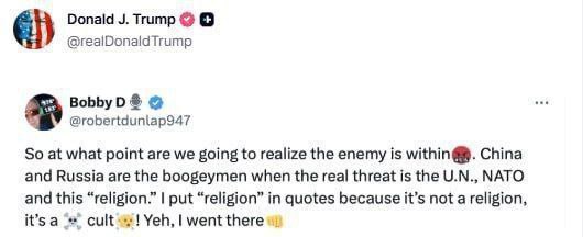 «Ե՞րբ ենք մենք գիտակցելու, որ թշնամին ներսում է, և որ Չինաստանն ու Ռուսաստանը պարզապես արհեստականորեն են սարսափ ներկայացվում, իսկ իրական սպառնալիքը ՄԱԿ-ն է, ՆԱՏՕ-ն և այս «կրոնը»։ Ես «կրոնը» չակերտների մեջ եմ դրել, քանի որ դա կրոն չէ, այլ աղանդ», - ասվում էր հաղորդագրության մեջ։
