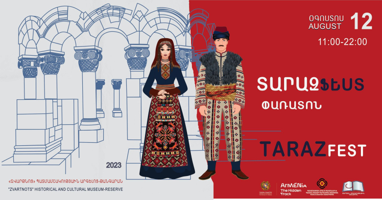 Культура12 августа в историко-культурном музее-заповеднике «Звартноц» пройдет фестиваль «ТАРАЗфест». Данный фестиваль содержит в себе туристическую составляющую и направлен на распространение культуры армянского народа, в особенности показа армянского национального костюма (Тараз) как среди армянского общества, так и среди иностранного общества.