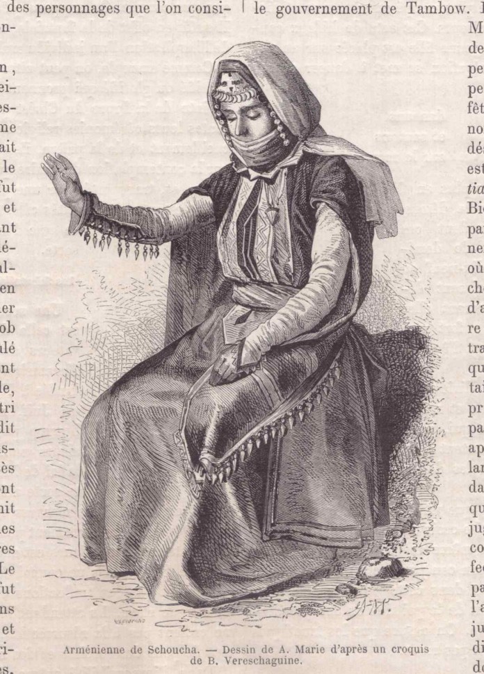 В антикварном французском издании 1870-х годов сохранилась гравюра по его рисунку: армянка из Шуши, в сложном национальном костюме, с выражением достоинства и силы.
