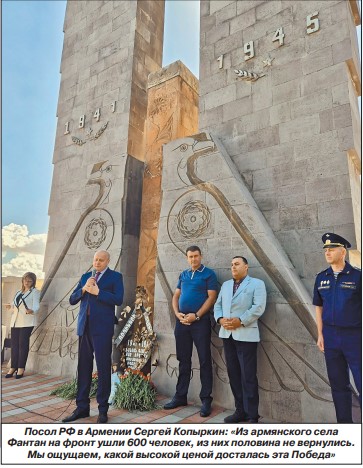 «Война коснулась каждой семьи в Советском Союзе. Многие не вернулись домой. По Армении из 600 тысяч мобилизованных погибли около 300 тысяч воинов. И из армянского села Фантан на фронт ушли 600 человек, из них половина не вернулись. Мы ощущаем, какой высокой ценой досталась эта Победа, – подчеркнул глава российской дипмиссии. – Мы с огромным уважением и любовью относимся к ветеранам, которых становится все меньше. И то, что сегодня молодежь берет на себя миссию по сохранению памяти, имеет исключительное значение». Также Сергей Копыркин подчеркнул, что в Армении именно молодежные организации стали инициаторами и исполнителями проектов по восстановлению мемориалов в честь героев ВОВ и важно, чтобы эстафета памяти передавалась новым поколениям.