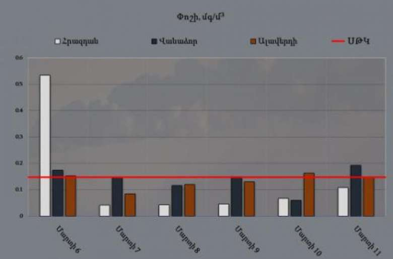 Մթնոլորտային օդում փոշու պարունակությունը գերազանցել է սահմանային թույլատրելի կոնցենտրացիան Հրազդանում՝ մարտի 6-ին, Վանաձորում՝ մարտի 6-ին, 7-ին, 9-ին, 11-ին, Ալավերդիում՝ մարտի 6-ին, 10-ին, 11-ին։