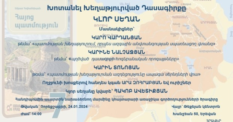 Կլոր սեղանին ելույթներով կմասնակցեն Կարո Վարդանյանը («Պատմության խեղաթյուրումը՝ որպես ազգային անվտանգությանն սպառնացող վտանգ»), Կարինե Նալչաջյանը («Պղծված դասագրքի հոգեբանական որոգայթները») եւ Կարին Տոնոյանը («Պատմության խեղաթյուրման ազդեցությունը ապագա սերունդների վրա»):