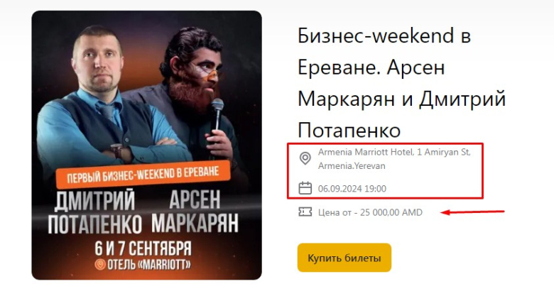 ՀասարակությունՊարզվում է՝ գալիք շաբաթվա վերջին իր ադրբեջանամետ մտքերով հայտնի բլոգեր ԱՐՍԵՆ ՄԱՐԿԱՐՅԱՆԸ, որը նաեւ ձեռնարկատեր է, մարզիչ, տղամարդկանց ինչ-որ մասշտաբային խմբի հիմնադիր եւ «Baza» փակ տելեգրամյան ալիքի հեղինակ, տնտեսագետ-վերլուծաբան Դմիտրի Պոտապենկոյի հետ լինելու է Երեւանում եւ անցկացնելու է հանդիպում՝ բիզնեսմենների համար: