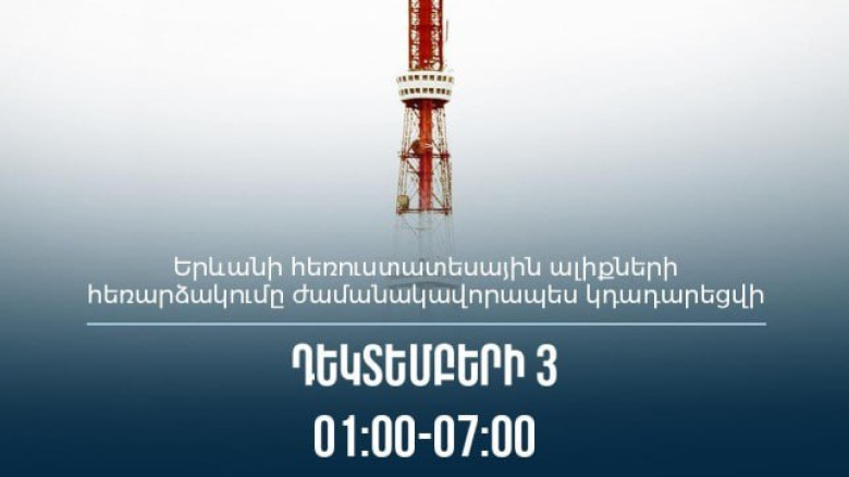 Դեկտեմբերի 3-ին՝ ժամը 01։00-07։00-ն ընկած ժամանակահատվածում, Երևանի հեռուստատեսային ալիքների հեռարձակումը ժամանակավորապես կդադարեցվի։