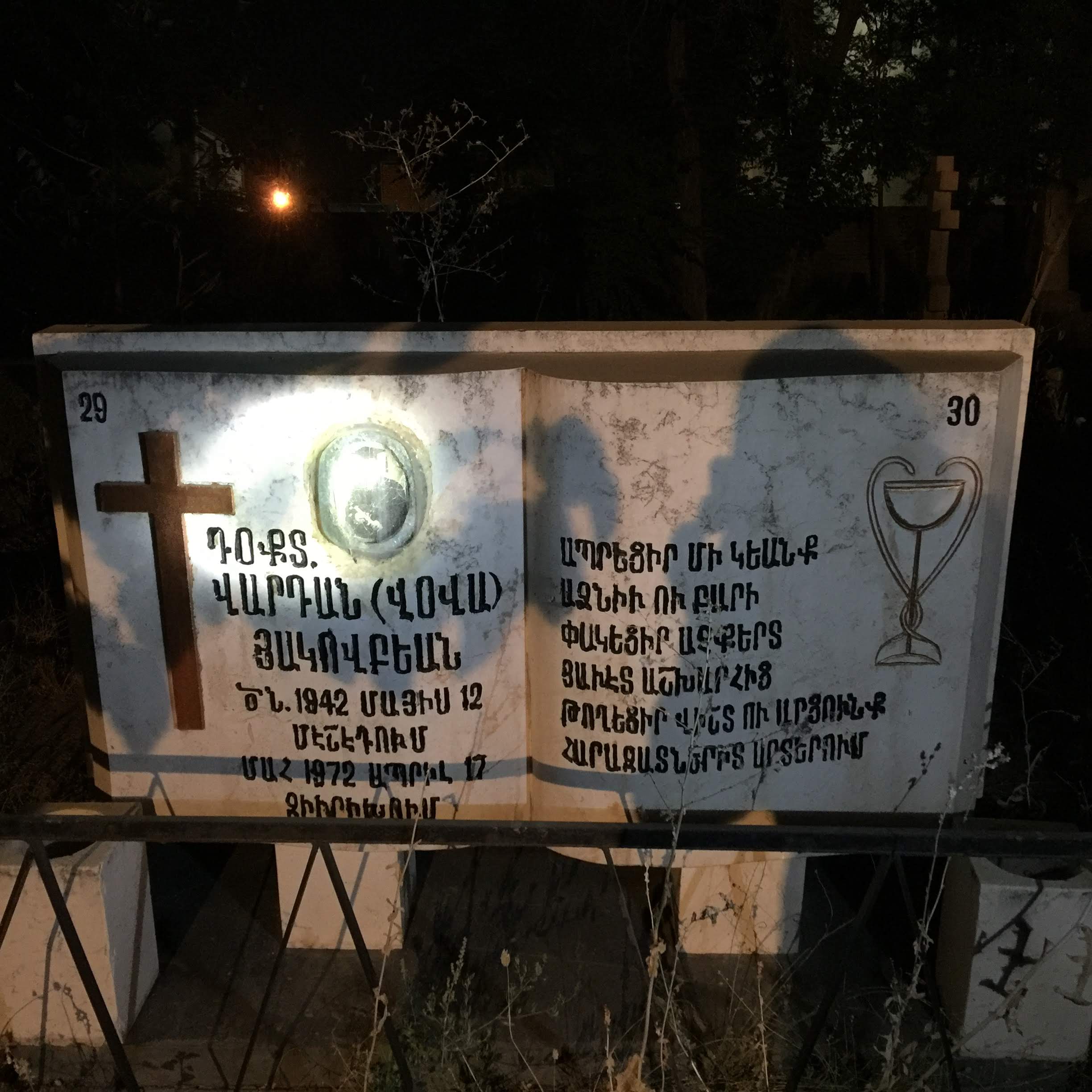Ահա Մարո Հակոբյանի գերեզմանը, որը ծնվել է Ուրմիայում 1911 թվականին և մահացել Մաշհադում 1985 թվականին։ Կողքին Պետրոսն է՝ նրա ամուսինը՝ ծնված 1901 թվականին Սպահանում։ Ահա Սարգիս Քեշիշչյանի գերեզմանաքարը, որն ապրել է համեստ ու աշխատասեր կյանքով։ Ահա Թեհրանում ծնված Մելքոն Հարությունյանի գեղեցիկ տապանանաքարը։ Այնուհետև ռուսական գերեզմաններն են։ Ազգանունների մեջ մեքենայորեն փնտրում եմ ինչ-որ հարազատ բան, բայց ոչ՝ չհամընկավ։