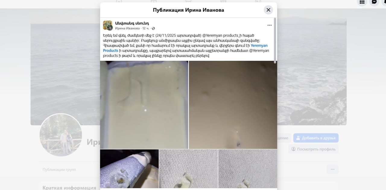 «Երեկ եմ գնել, ժամկետի մեջ է (24/11/2025 արտադրված) @Yeremyan products_ի հալած սերուցքային պանիր։ Բացելուց անմիջապես աչքիս ընկավ այս անհասկանալի զանգվածը։ Հիասթափված եմ, քանի որ համարում էի որակյալ արտադրանք և վերջերս գնում էի Yeremyan Products ի արտադրանքը, պայքարելով արտասահմանյան այլընտրանքի համեմատ @Yeremyan products ի թարմ և որակյալ լինելը որպես փաստարկ բերելով»։