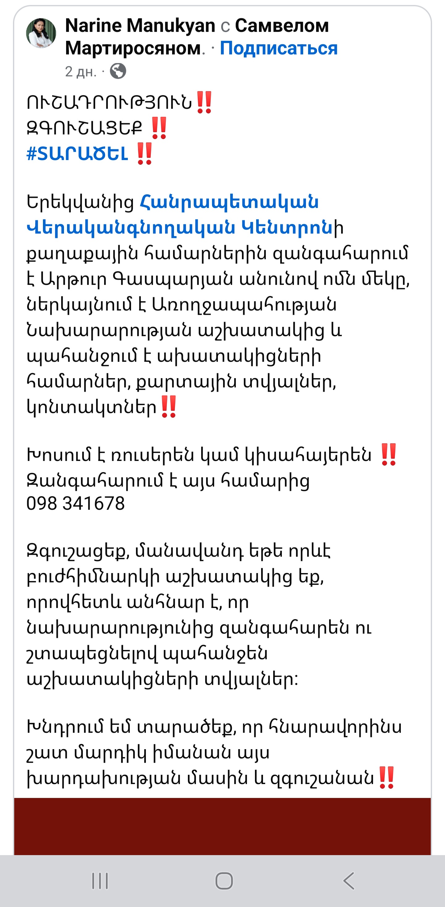 Երեկվանից Հանրապետական Վերականգնողական Կենտրոնի քաղաքային համարներին զանգահարում է Արթուր Գասպարյան անունով ոմն մեկը, ներկայնում է Առողջապահության Նախարարության աշխատակից և պահանջում է ախատակիցների համարներ, քարտային տվյալներ, կոնտակտներ‼️