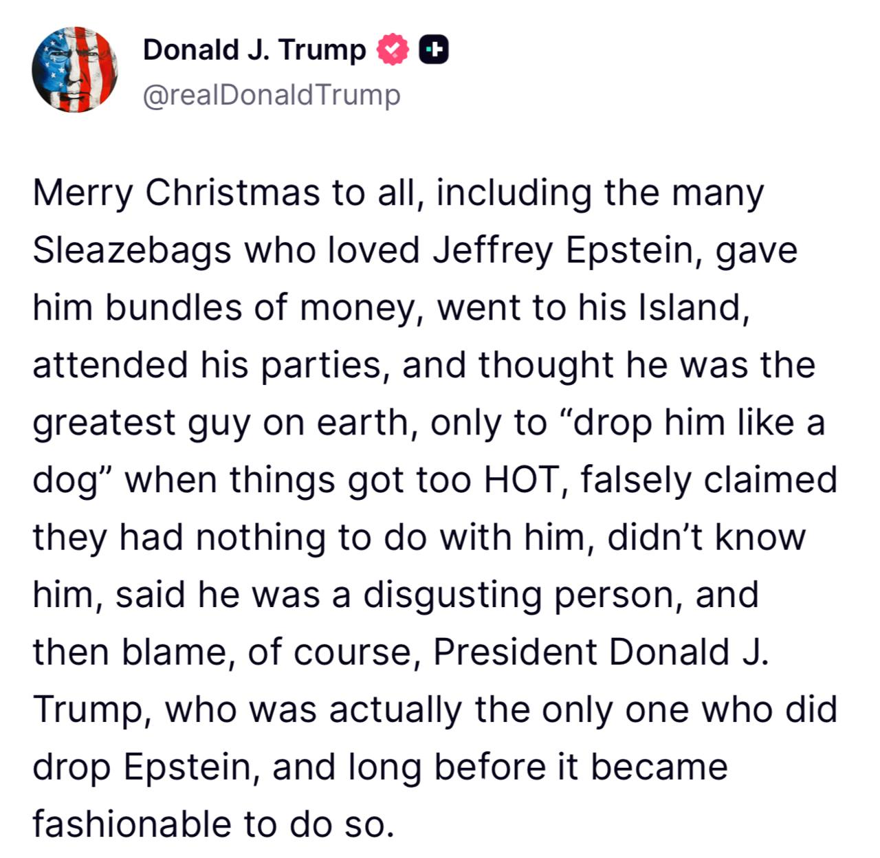 «Շնորհավոր Սուրբ Ծնունդ բոլորին, այդ թվում՝ բազմաթիվ անպետք մարդկանց, ովքեր սիրում էին Ջեֆրի Էպշտեյնին, նրան գումար էին տալիս, այցելում էին նրա կղզի, մասնակցում նրա երեկույթներին և կարծում, որ նա երկրի լավագույն տղան է: Միայն թե թողնեցին նրան, «ինչպես շանը», երբ իրավիճակը չափազանց «տաքացավ»: Կեղծ պնդումներով, որ նրա հետ ոչ մի կապ չունեն։ Նրանք վատ էին վերաբերվում նրան, չէին ճանաչում նրան, զզվելի մարդ էին անվանում: Իսկ հետո, իհարկե, մեղադրում էին նախագահ Դոնալդ Թրամփին, ով իրականում միակն էր, ով լքեց Էպշտեյնին՝ շատ առաջ, նախքան նրա նորաձև դառնալը։