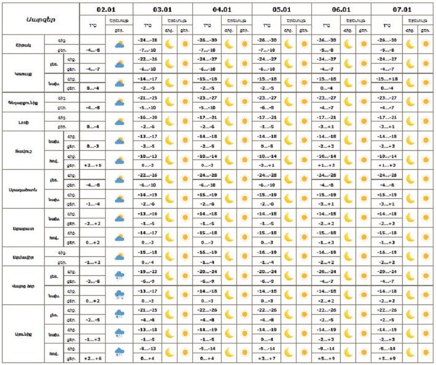 Օդի ջերմաստիճանը հունվարի 3-4-ը հանրապետության ողջ տարածքում գիշերը կնվազի 14-18 աստիճանով։