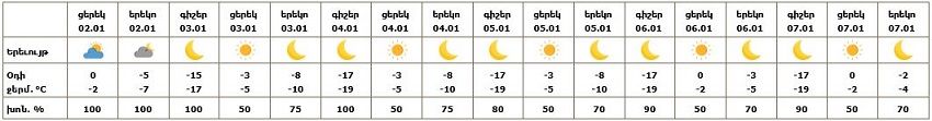 Հունվարի 2-ի ցերեկը՝ Վայոց ձորում և Սյունիքում սպասվում է ձյուն, առանձին հատվածներում՝ զգալի: Հունվարի 3-7-ը սպասվում է առանց տեղումների եղանակ։