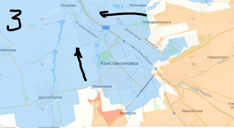 Միաժամանակ ռուսները գրոհում են Ստեպանովկա եւ Դոլգայա Բալկա բնակավայրերը, որոնք գրավելու եւ Իլնովկայի հատվածում ճեղքումային ուժերի թեւն ապահովելու դեպքում ռուսական ստորաբաժանումների առաջ այլեւս խոչնդոտներ չեն մնւոմ` Կոնստանտինովկայի ողջ արեւմտյան թեւը վերահսկոլու համար: Հաշվի առնելով, որ քաղաքի հյուսիսը փակելու նպատակով ռուսները եւս ակտիվ հարձակման մեջ են, այս ֆոնը Կոնստանտինովկային խոստանում է ամբողջական շրջապատում (քարտեզ 3):