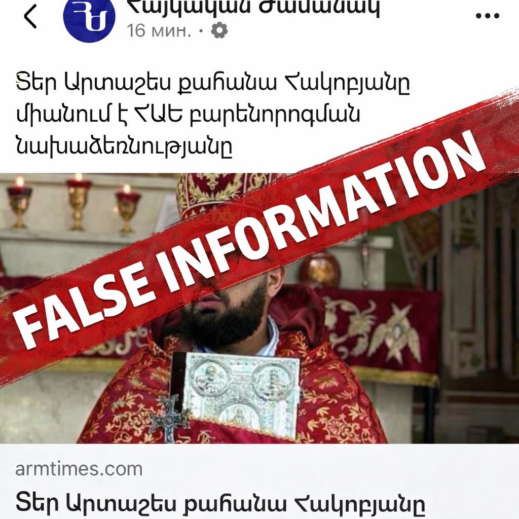 Թեմա«Այսօր մամուլում և սոցիալական հարթակներում տարածվում են իրականությանը չհամապատասխանող տեղեկություն, ըստ որի իբր ես միացել եմ «եկեղեցու բարեկարգման» նախաձեռնությանը։ Տարածվող նյութերում այդ լուրերը ուղեկցվում են իմ լուսանկարներով, ինչը մարդկանց մոտ ստեղծել է թյուր տպավորություն և արդարացի դժգոհություն։